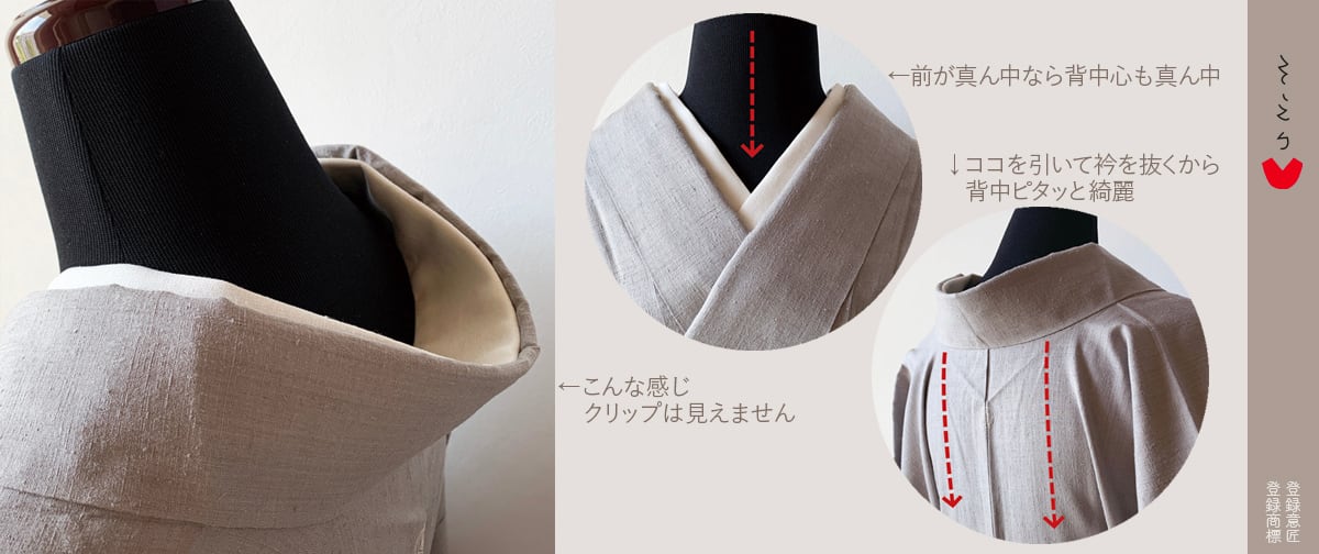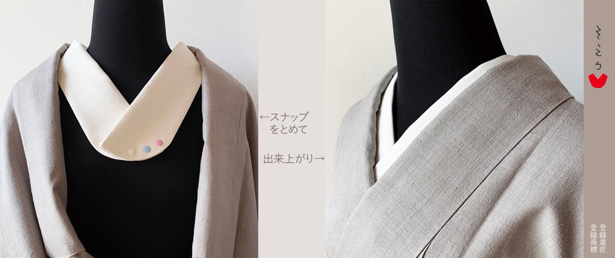 0039「音日本」そえり Japaneseの発音記号を! ーーーーーーーーーーーーーーーー 着物に直接添える衿〔そえり〕です ーーーーーーーーーーーーーーーー 着物を着る楽しみのひとつとして〔そえり〕を作りました ・ とてもシンプルです スッキリしているのでお洗濯をするのも仕舞うのも簡潔です ・ 浴衣を着るように着物1枚を羽織って衿を抜いて着る その着物に添える衿が〔そえり〕です 小さなクリップ4個で着物に留め付けたら ゆったりと衿を抜いて着物を着てください 下着は好きなもので たとえばうそつき袖を付けた肌着 たとえば汗とり肌着 たとえば補整肌着 肌着のこだわりポイントは人それぞれだと思います 好きな肌着で心地よく 好きな着物に〔そえり〕を添えてください ーーーーーーーーーーーーーーーー 1枚で幅広いサイズとイメージに対応! ゆったり熟れた衿元にも きちんと詰めた衿元にも ◯白スナップ(ゆったり熟れ感) ◯ブルースナップ(すこし小さくキリッと) ◯ピンクスナップ(もっと小さくキュッと) 左右の同じ色どうしのスナップを1箇所とめて 衿合わせ角度や衣紋の抜き加減は着物にあわせて自由にできます スナップは3サイズ基本的に角度自由ですけれど 白とブルーをとめる ブルーと白をとめる この2箇所をとめてゆったりイメージに固定することも出来ます 白地コットンのオックスフォード生地は畝のようにみえて趣があります 季節を問わずご使用いただけるかと思います 表生地/綿100% 裏生地/綿100% 芯/ポリエステル100% 芯入り形成済み クリップ4個付き 【ご購入前にご確認ください】 ・中央2箇所のクリップは着用時お体に触れることはありません。外側2箇所は留めたほうが安定しますが、もし肌に触れて気になる場合は留め位置を少し内側にずらしてご使用ください。 ・制作は一人で手作業にて行っておりますため、わずかな歪みや微妙な個体差が生じる場合がございます。 ・天然繊維のため、ネップや筋が見られる場合がございます。また、染色工程上、ごく小さな色ムラや色飛びが生じることがございます。 ・ご家庭でも使用されるようなアイロン等の道具を使って制作しております。仕上げの際に若干の皺が残ることがございます。 ・バチ衿の場合や金属に抵抗がある場合はクリップを使わずに軽く縫い留めるか半衿用両面テープをご自身の判断でご使用ください。 ・長襦袢に付ける場合は、〔そえり〕をかぶせるように長襦袢の衿にのせて、外側を軽く縫い留めてご使用ください。〔そえり〕の折り目がカーブしているので少しコツが必要かもしれません。スナップ留めは出来ませんけれど、衿芯不要で外側だけを縫い留めておけば〔そえり〕を折って使用出来ます。ただ、長襦袢の衿幅が〔そえり〕より広い場合は長襦袢の衿が衣紋から見えてしまいます。 ・お洗濯はなるべく手洗いで脱水は極短時間にしてください。干すときや仕舞うときは裏面を外側にしておくと着用時お体に添いやすいです。 ・保管時にわたしの好きな香りの匂い袋を入れているため、ほのかに和の香りが移っている場合がございます。