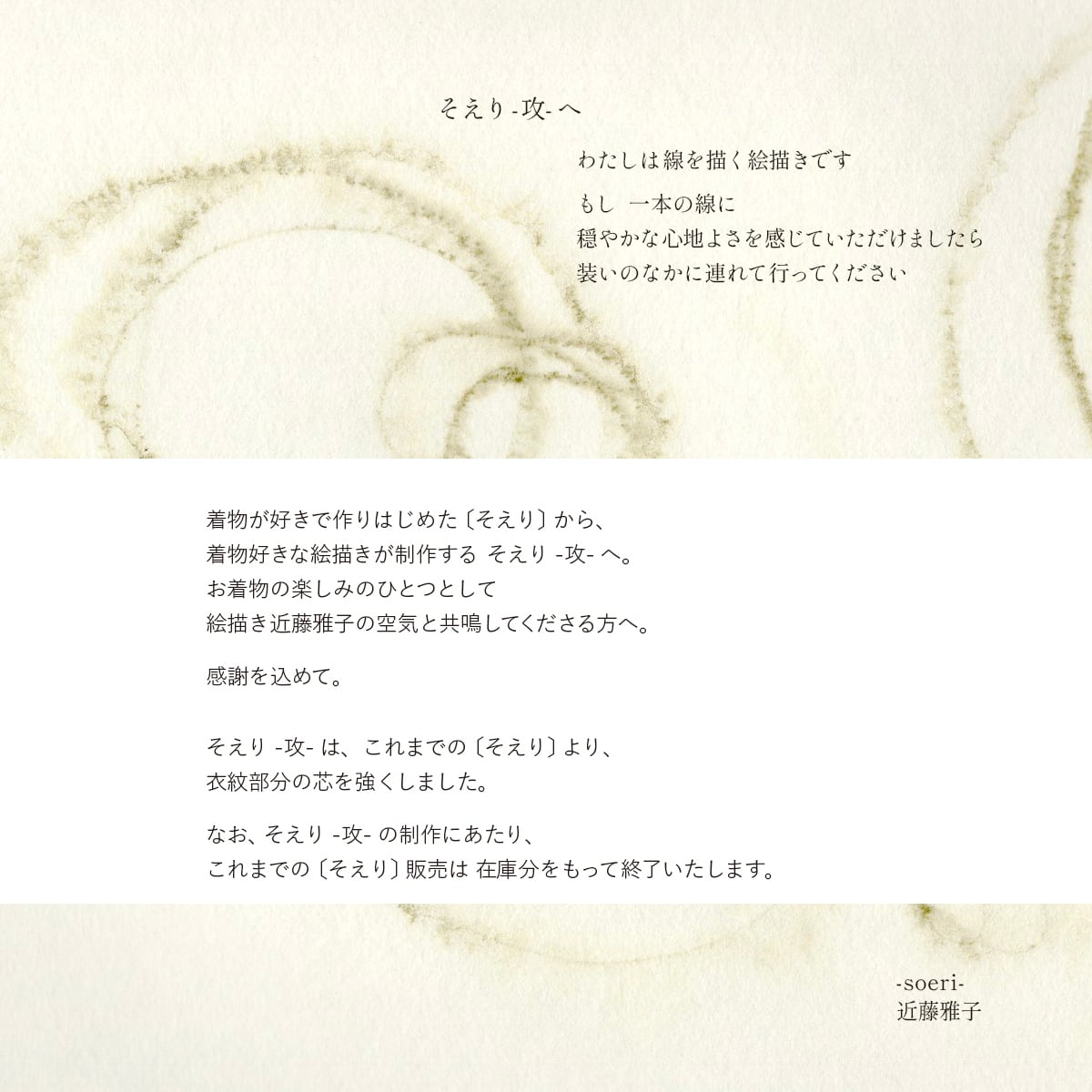 0046「夕暮れ」そえり これまでにありがとう これからにわくわく 夕暮れに感じるひととき ーーーーーーーーーーーーーーーー シンプルな形状!模様で遊ぶ! 着物に直接添える衿〔そえり〕です ーーーーーーーーーーーーーーーー 着物を着る楽しみのひとつとして〔そえり〕を作りました ・ とてもシンプルです スッキリしているのでお洗濯をするのも仕舞うのも簡潔です ・ 浴衣を着るように着物1枚を羽織って衿を抜いて着る その着物に添える衿が〔そえり〕です 小さなクリップ4個で着物に留め付けたら ゆったりと衿を抜いて着物を着てください 下着は好きなもので たとえばうそつき袖を付けた肌着 たとえば汗とり肌着 たとえば補整肌着 肌着のこだわりポイントは人それぞれだと思います 好きな肌着で心地よく 好きな着物に〔そえり〕を添えてください ーーーーーーーーーーーーーーーー 1枚で幅広いサイズとイメージに対応! ゆったり熟れた衿元にも きちんと詰めた衿元にも ◯白スナップ(ゆったり熟れ感) ◯ブルースナップ(すこし小さくキリッと) ◯ピンクスナップ(もっと小さくキュッと) 左右の同じ色どうしのスナップを1箇所とめて 衿合わせ角度や衣紋の抜き加減は着物にあわせて自由にできます スナップは3サイズ基本的に角度自由ですけれど 白とブルーをとめる ブルーと白をとめる この2箇所をとめてゆったりイメージに固定することも出来ます コットンリネンの生成り色の生地です 季節を問わずご使用いただけるかと思います 表生地/綿45% リネン55% 裏生地/綿100% 芯/ポリエステル100% 芯入り形成済み クリップ4個付き 【ご購入前にご確認ください】 ・中央2箇所のクリップは着用時お体に触れることはありません。外側2箇所は留めたほうが安定しますが、もし肌に触れて気になる場合は留め位置を少し内側にずらしてご使用ください。 ・制作は一人で手作業にて行っておりますため、わずかな歪みや微妙な個体差が生じる場合がございます。 ・天然繊維のため、ネップや筋が見られる場合がございます。また、染色工程上、ごく小さな色ムラや色飛びが生じることがございます。 ・ご家庭でも使用されるようなアイロン等の道具を使って制作しております。仕上げの際に若干の皺が残ることがございます。 ・バチ衿の場合や金属に抵抗がある場合はクリップを使わずに軽く縫い留めるか半衿用両面テープをご自身の判断でご使用ください。 ・長襦袢に付ける場合は、〔そえり〕をかぶせるように長襦袢の衿にのせて、外側を軽く縫い留めてご使用ください。〔そえり〕の折り目がカーブしているので少しコツが必要かもしれません。スナップ留めは出来ませんけれど、衿芯不要で外側だけを縫い留めておけば〔そえり〕を折って使用出来ます。ただ、長襦袢の衿幅が〔そえり〕より広い場合は長襦袢の衿が衣紋から見えてしまいます。 ・お洗濯はなるべく手洗いで脱水は極短時間にしてください。干すときや仕舞うときは裏面を外側にしておくと着用時お体に添いやすいです。 ・保管時にわたしの好きな香りの匂い袋を入れているため、ほのかに和の香りが移っている場合がございます。