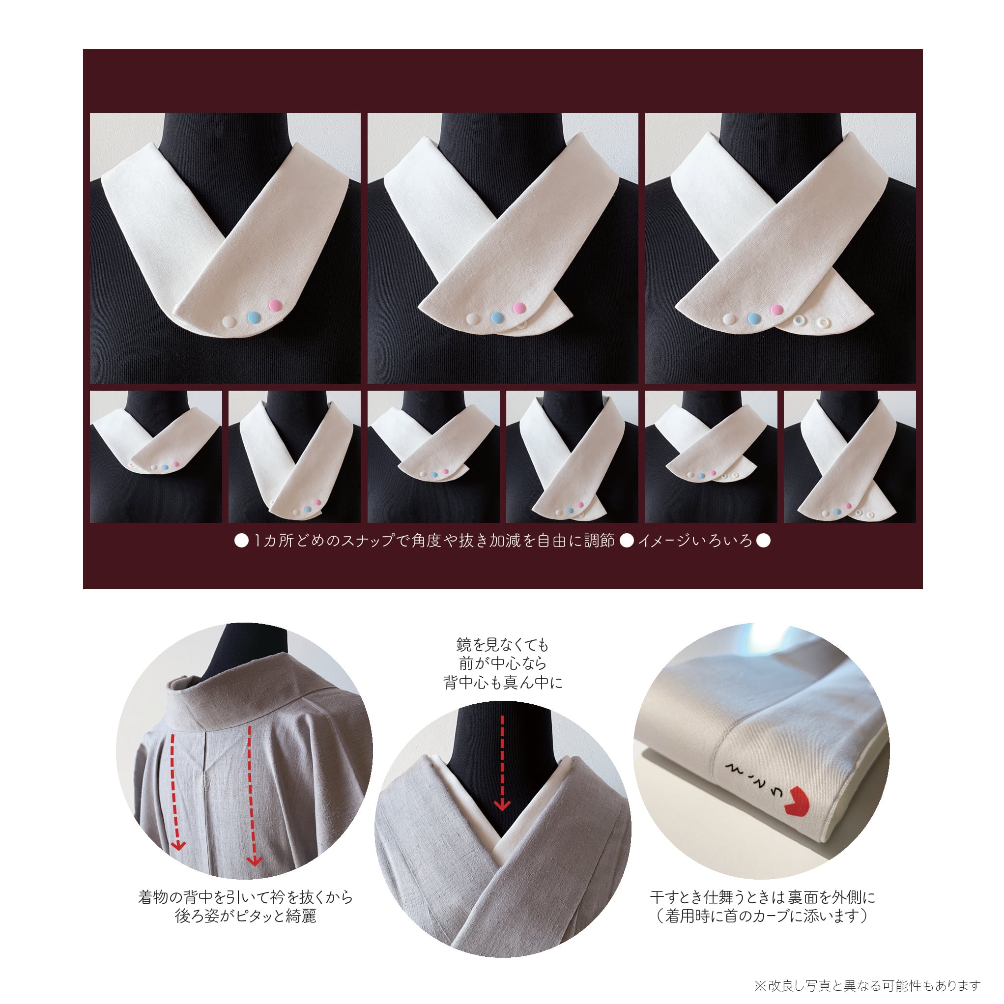 ・バチ衿の場合や金属に抵抗がある場合はクリップを使わずに軽く縫い留めるか半衿用両面テープをご自身の判断でご使用ください。